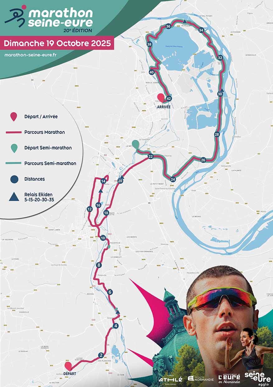 Le départ se fera à 9h00 et 9h30 respectivement pour le marathon et l’Ekiden, du petit village d’Amfreville sur Iton. Après avoir passé Acquigny, les coureurs se retrouveront dans un tronçon urbain qui les mènera de Louviers à Incarville, avant de retrouver la campagne Euroise au 15ème kilomètre. Une ballade champêtre, bercée par les étangs et les Seine, qui mènera les coureurs jusqu’au Mesnil de Poses en passant par Tournedos, pour se retrouver ensuite sur le chemin du halage, jusqu’aux écluses : 2500 mètres dans la charmante cité batelière qui raviront les amateurs d’authenticité, avec les bateaux, les vieilles pierres et la nature préservé. Et possiblement les canards. A la sortie de Poses, les participants passeront par centre de loisirs en empruntant les chemins qui longent l’étang des deux amants. La dernières partie du trajet se fait par la voie verte, pour finalement arriver à Val de Reuil.